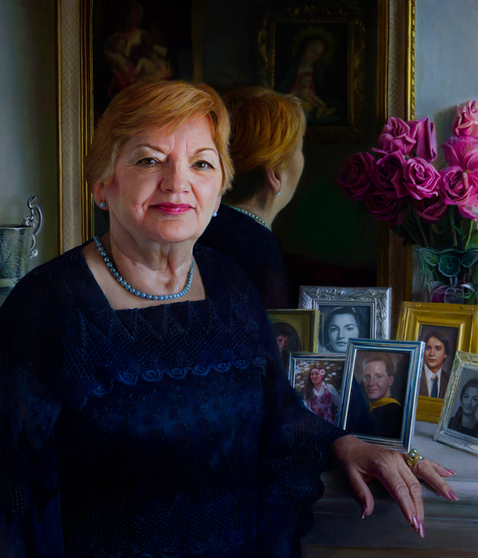 I study these to understand the subject as a fully dimensional presence. Then I create a composite, selecting the best elements from multiple photos—one eye from here, another from there, the mouth from a third. The resulting collage simulates what I intend to paint.